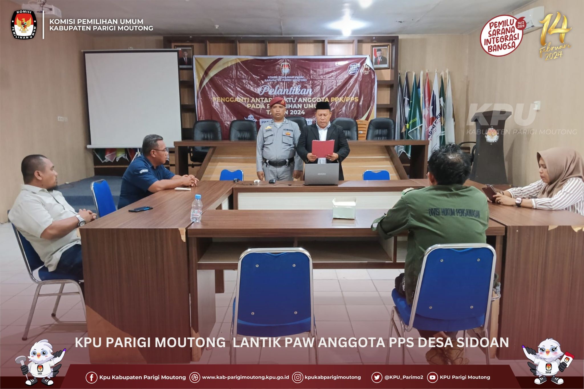 Parigi, kab-parigimoutong.kpu.go.id - Komisi Pemilihan Umum (KPU) Kabupaten Parigi Moutong melantik Pengganti Antar Waktu (PAW) Anggota Panitia Pemungutan Suara (PPS) Desa Sidoan Kecamatan Sidoan, Selasa (5/9/2023) Pelantikan dan pengambilan sumpah yang dilakukan secara daring itu dimulai pada pukul 14.30 wita oleh Ketua KPU Parigi Moutong, Dirwan Korompot . "Diharapkan PAW Anggota PPS Desa Sidoan yang baru saja dilantik, untuk dapat melaksanakan tugas dengan baik sesuai tupoksinya dan cepat menyesuaikan diri untuk berbaur bersama teman-teman lainnya," ujar Dirwan usai pelantikan. Pelantikan tersebut berdasarkan Surat Keputusan Ketua KPU Kabupaten Parigi Moutong Nomor 629 Tahun 2023 tentang Pengganti Antar Waktu Panitia Pemungutan Suara Desa Sidoan Kecamatan Sidoan untuk Pemilu Tahun 2024. PAW Anggota PPS Desa Sidoan tersebut atas nama Magfirah menggantikan Nurhapizah. Pelantikan dihadiri oleh Ketua dan Anggota KPU Parigi Moutong, Sekretaris dan Para Kepala Sub Bagian serta Staf Sekretariat dilingkungan KPU Parigi Moutong serta PPS dan PPK Sidoan. (humas kpu kab parimo wirma/foto syukran/ed taufik)