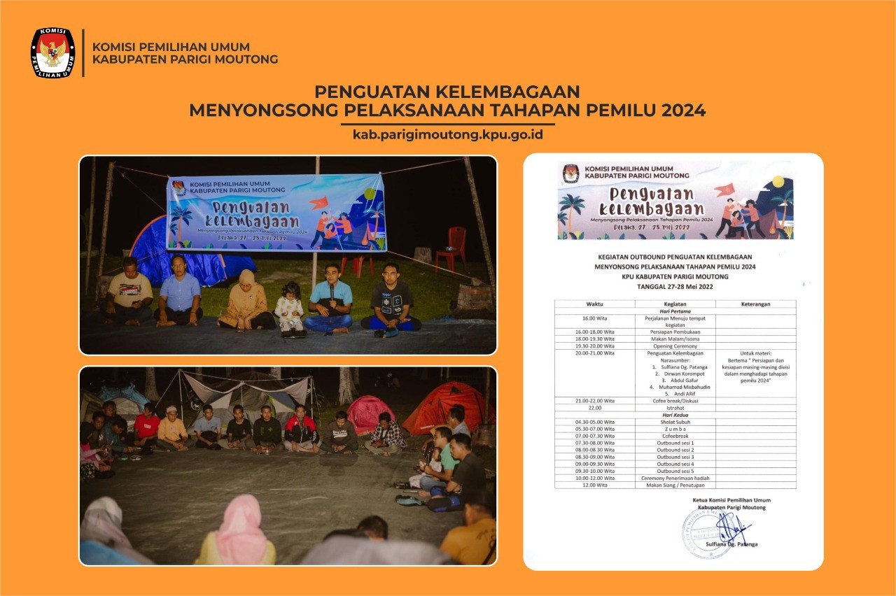Parigi, Komisi Pemilihan Umum Kabupaten Parigi Moutong melaksanakan kegiatan Penguatan Kelembagaan dengan tema “Menyongsong Pelaksanaan Tahapan Pemilu 2024” yang diikuti oleh Komisioner KPU Kabupaten Parigi Moutong, Sekretaris, Kasubag, ASN, PPNPN dan tenaga outsorsing di lingkungan Komisi Pemilihan Umum Kabupaten Parigi Moutong. Kegiatan Penguatan Kelembagaan dilaksanakan selama 2 (dua) hari, mulai tanggal 27 sampai dengan tanggal 28 Mei 2022. Kegiatan Penguatan kelembagaan ini merupakan kegiatan yang pertama kalinya dilaksanakan di tempat terbuka yaitu di Pantai Lentora Desa Pelawa Kecamatan Parigi Tengah. Kegiatan ini berupa kemah bersama dan dirangkaikan dengan beberapa kegiatan yaitu Pemberian Materi dan diskusi (Tanya jawab), Senam Pagi (zumba) dan kegiatan outbond. Adapun tujuan dari kegiatan ini yakni untuk mempererat hubungan silaturahim, membangun kerjasama yang baik, menguatkan fisik dan mental serta mempersiapkan diri menghadapi tahapan Pemilu 2024. Melalui kegiatan ini, Komisioner KPU Kabupaten Parigi Moutong menyampaikan untuk senantiasa meningkatkan keimanan dan ketakwaan, menjalin kebersamaan yang harmonis serta saling menjaga kekompakan dalam kelembagaan.