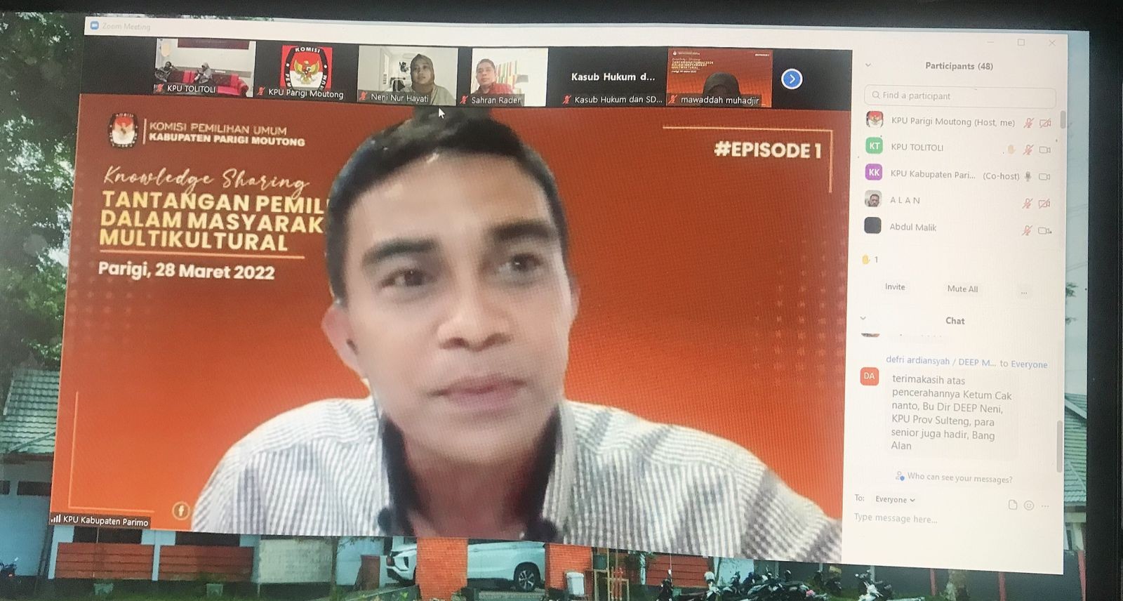 Kab-parigimoutong.kpu.go.id, Parigi – Komisi Pemilihan Umum Kabupaten Parigi Moutong gelar kegiatan “Knowledge Sharing episode 1” dengan tema “Tantangan Pemilu 2024 dalam Masyarakat Multikultural” secara daring melalui Zoom Meeting. Senin (28/03/2022)
