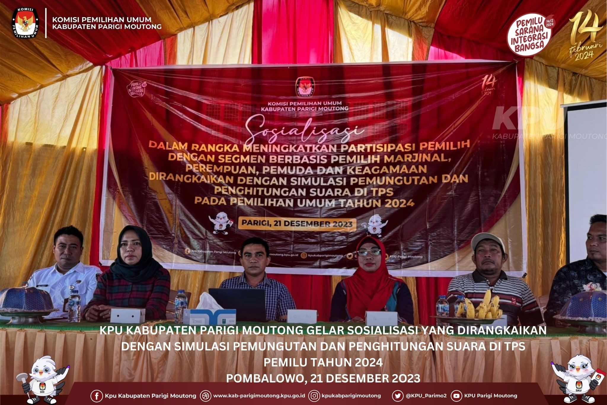 Parigi, kab-parigimoutong.kpu.go.id - Komisi Pemilihan Umum (KPU) Kabupaten Parigi Moutong menggelar sosialisasi dalam rangka meningkatkan partisipasi pemilih dengan segmen berbasis pemilih marjinal, perempuan, pemuda dan keagamaan yang dirangkaikan dengan simulasi pemungutan dan penghitungan suara di Tempat Pemungutan Suara (TPS) pada Pemilihan Umum (Pemilu) Tahun 2024 di Desa Pombalowo Kecamatan Parigi, Kamis (21/12/2023). Kegiatan sosialisasi itu dibuka oleh Ketua Devisi Sosialisasi Pendidikan Pemilih, Partisipasi dan Sumber Daya Manusia (SDM), Abdul Gafur. Ia mengatakan bahwa sosialisasi yang dilakukan oleh KPU menyasar segmen pemilih pemula, pemilih muda, pemilih perempuan, pemilih penyandang disabilitas, kelompok marjinal, komunitas, kelompok keagamaan dan warga internet (Netizen) sebagaimana diatur dalam Peraturan KPU Nomor 9 Tahun 2022 tentang Partisipasi Masyarakat dalam Pemilihan Umum dan Pemilihan Gubernur dan Wakil Gubernur, Bupati dan Wakil Bupati, dan/atau Walikota dan Wakil Walikota. "Kegiatan ini dilaksanakan guna memberikan pemahaman pemilih untuk menggunakan haknya pada hari pemungutan suara tahun 2024," kata Gafur. Gafur memberikan pendidikan pemilih yang hubunganya dengan politik identitas. Politik identitas biasanya dilakukan oleh oknum yang mempengaruhi pemilih untuk memilih calon tertentu yang memiliki kesamaan identitas agama, suku, serta kesamaan lainnya padahal seharusnya pemilih memilih calon yang memiliki visi, misi dan program kerja yang sesuai dengan harapan dan kebutuhan masyarakat secara umum. "Kami berharap dengan adanya sosialisasi hari ini masyarakat dapat memberikan suaranya pada 14 Februari 2024,tanpa tekanan karena adanya kesamaan identitas tertentu, mari kita sambut pesta demokrasi lima tahunan ini dengan gembira, dengan bahagia agar tercipta damai" ujar Gafur. Peserta kegiatan sosialisasi yakni masyarakat yang terdaftar dalam Daftar Pemilih Tetap (DPT) TPS 002 Desa Pombalowo Kecamatan Parigi dengan jumlah 235 pemilih. Turut hadir pada kegiatan itu Ketua KPU Parigi Moutong, Divisi Teknis Penyelenggara, Divisi Perencanaan Data dan Informasi, Kepala Sub Bagian Teknis, Staf Sekretariat KPU Parigi Moutong, Kepala Desa Pombalowo, Ketua dan Anggota PPK Parigi dan PPS Se-Kecamatan Parigi. (Humas KPU Parimo Wirma/Foto Wirma/Ed Gafur)