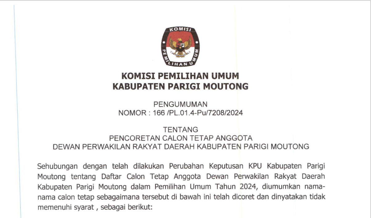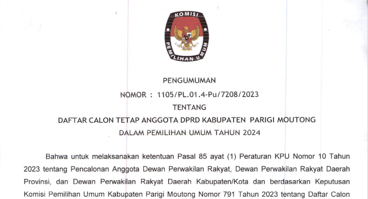 PENGUMUMAN PENCORETAN DAFTAR CALON TETAP ANGGOTA DPRD KABUPATEN PARIGI MOUTONG PEMILU TAHUN 2024 Senin, 12 Februari 2024 07:00 241 Pengumuman Pencoretan Daftar Calon Tetap Anggota DPRD Kabupaten Parigi Moutong Pemilu Tahun 2024 Silahkan download disini Baca Selengkapnya
