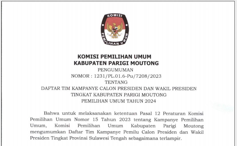 PENGUMUMAN DAFTAR TIM KAMPANYE CALON PRESIDEN DAN WAKIL PRESIDEN TINGKAT KABUPATEN PARIGI MOUTONG DALAM PEMILU TAHUN 2024 Rabu, 29 November 2023 14:27 219 silahkan dowload disini Baca Selengkapnya