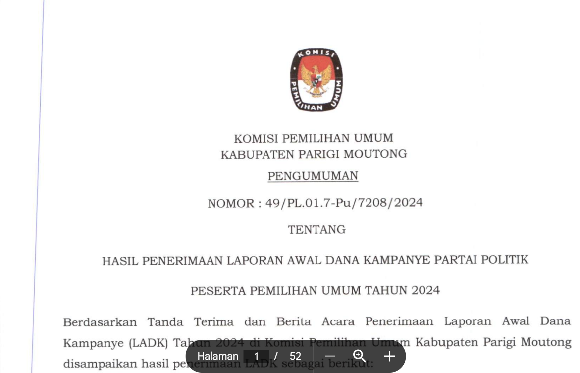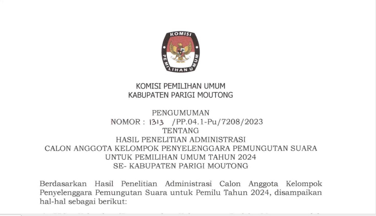 PENGUMUMAN HASIL PENELITIAN ADMINISTRASI CALON ANGGOTA KPPS UNTUK PEMILU TAHUN 2024 SE-KAB. PARIGI MOUTONG Senin, 25 Desember 2023 23:30 216 Silahkan klik disini Baca Selengkapnya