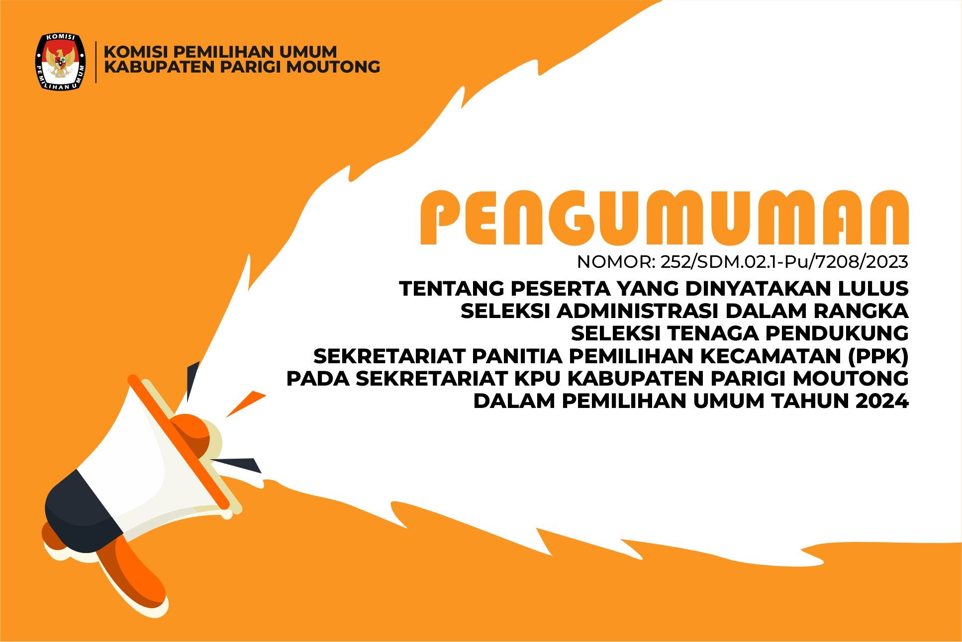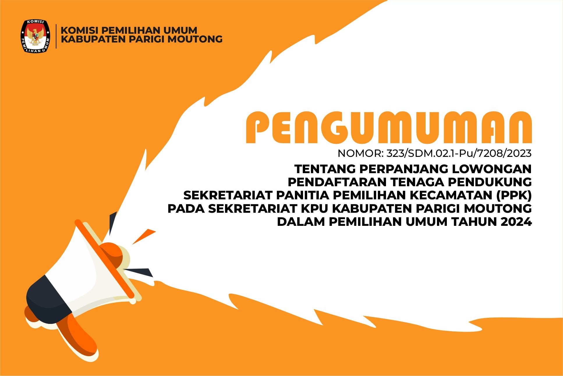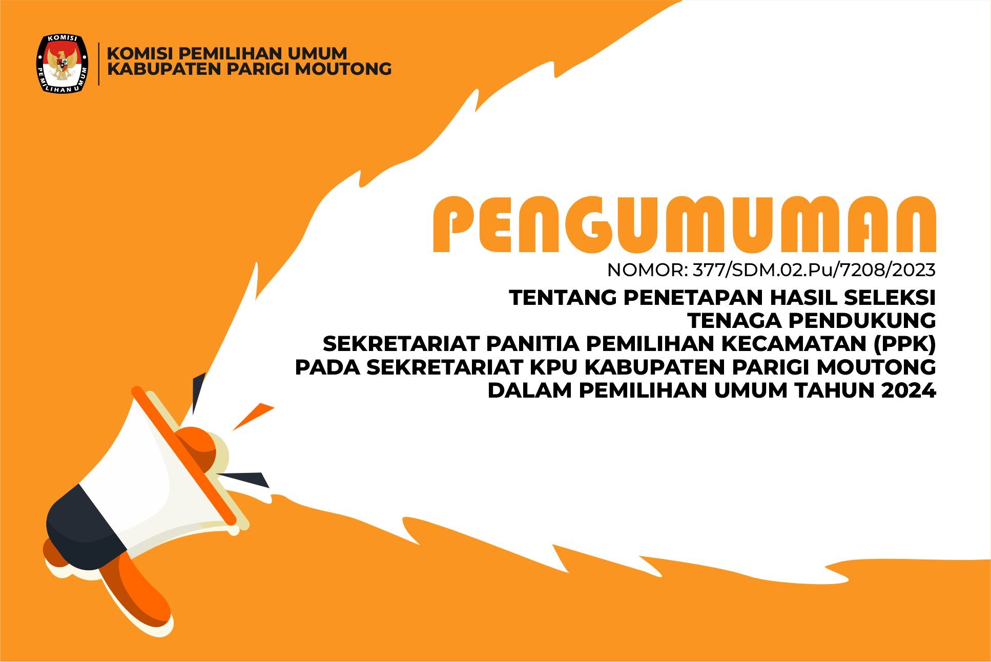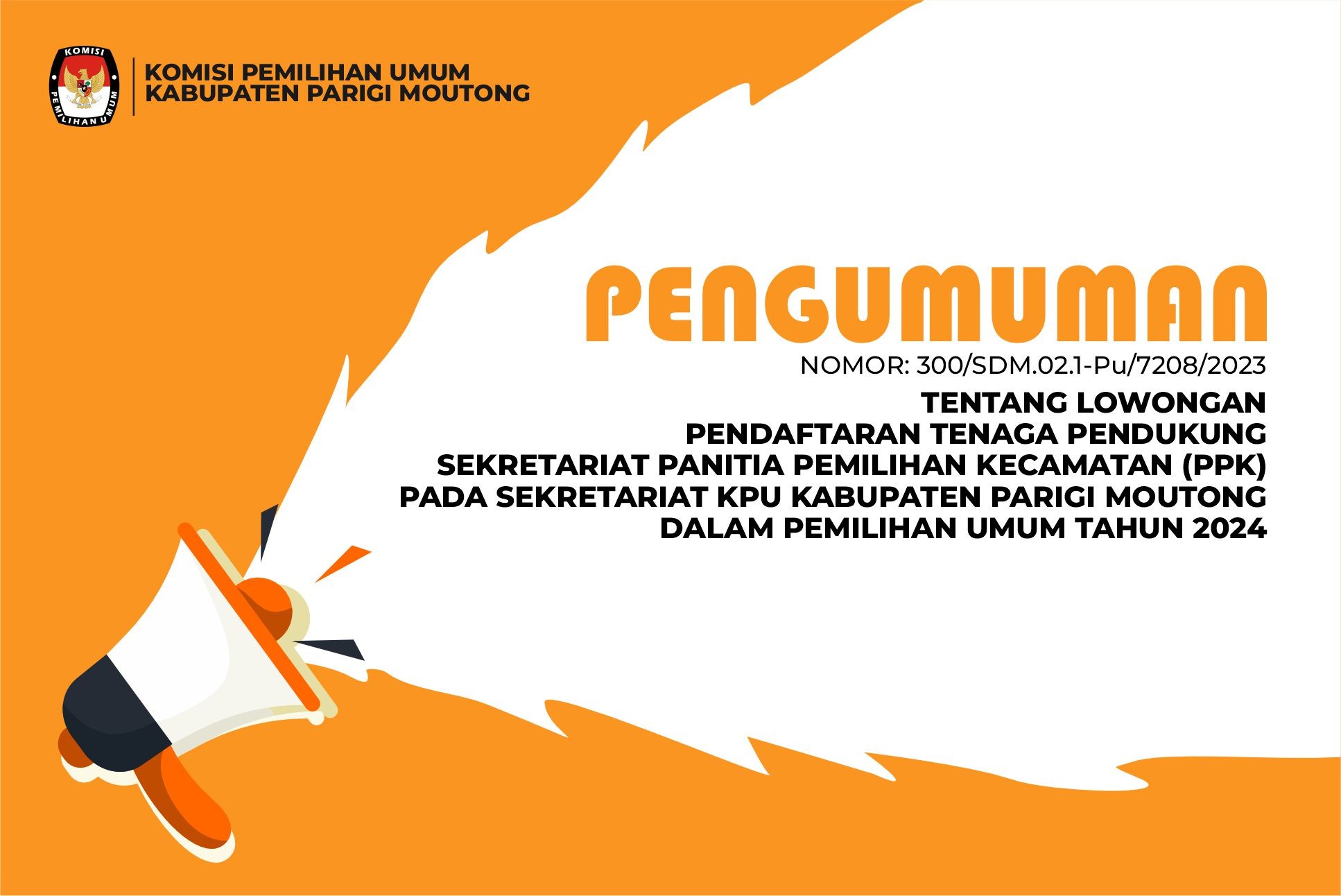Sekretaris Komisi Pemilihan Umum Kabupaten Parigi Moutong' memberi kesempatan kepada putra-putri terbaik bangsa untuk menjadi tenaga pendukung Sekretariat Panitia Pemilihan Kecamatan (PPK) pada Sekretariat KPU Kabupaten Parigi Moutong dalam Pemilihan Umum Tahun 2024, dengan ketentuan.