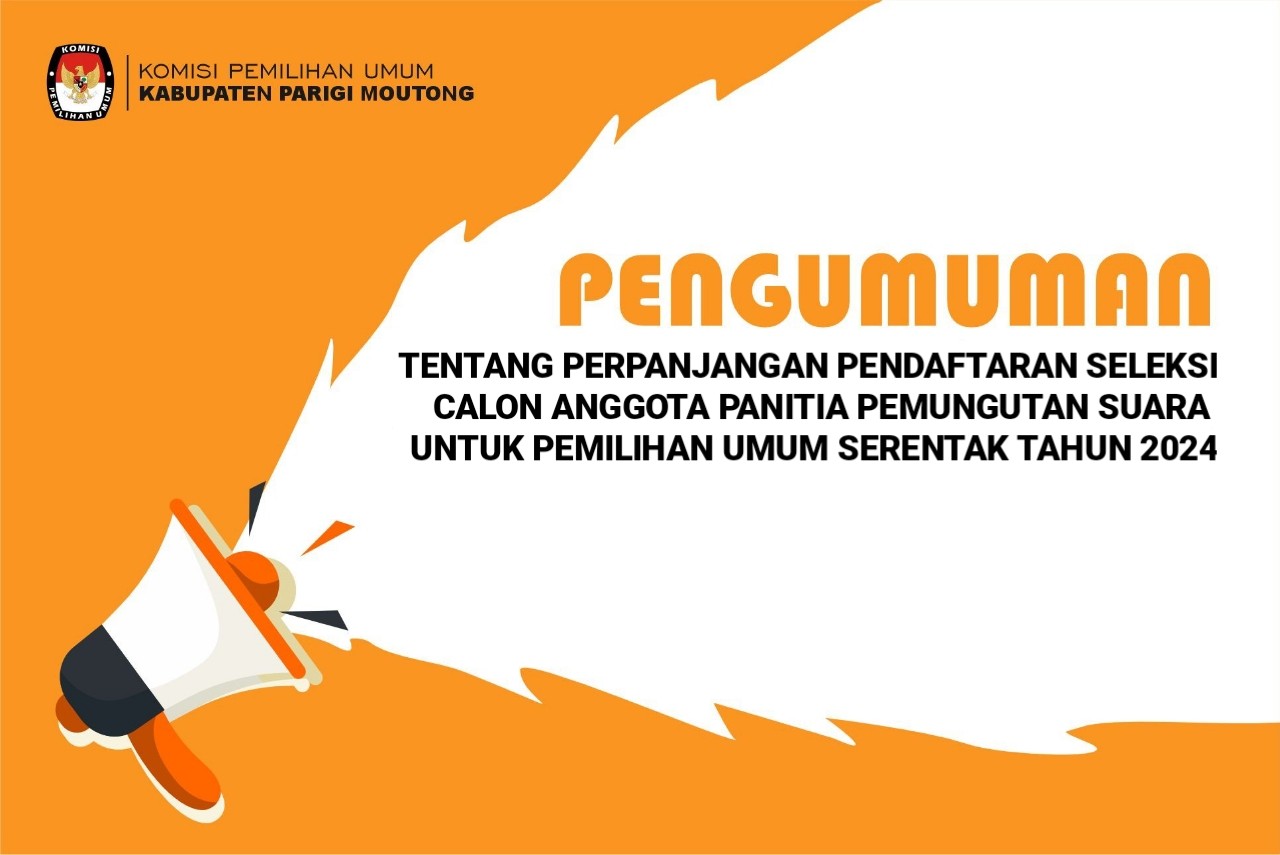 PENGUMUMAN PERPANJANGAN PENDAFTARAN SELEKSI CALON ANGGOTA PANITIA PEMUNGUTAN SUARA UNTUK PEMILIHAN UMUM SERENTAK TAHUN 2024 Sabtu, 31 Desember 2022 00:00 584 FILE PDF PENGUMUMAN PERPANJANGAN WAKTU PENDAFTARAN SELEKSI CALON ANGGOTA PANITIA PEMUNGUTAN SUARA DAPAT DILIHAT DISINI Baca Selengkapnya