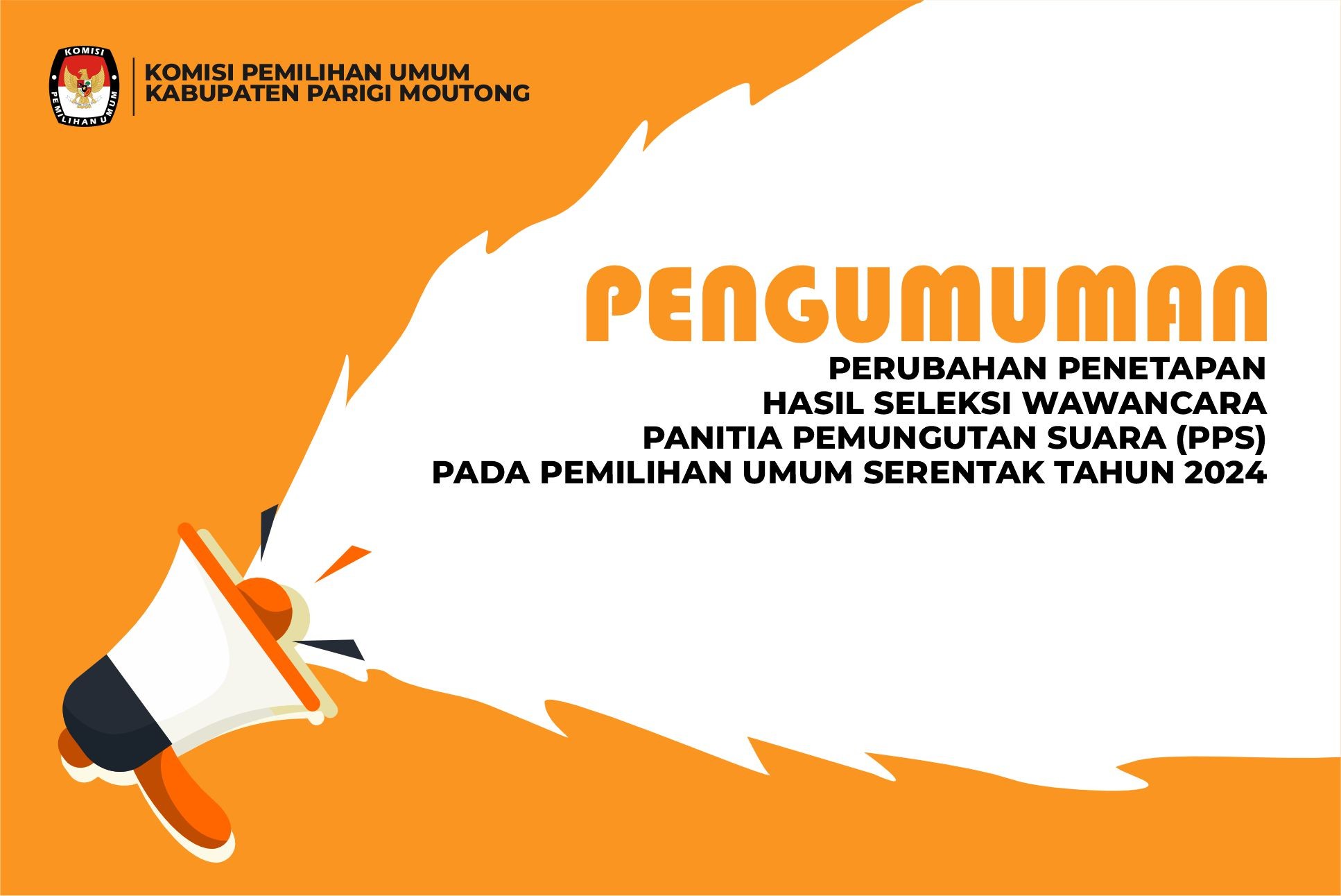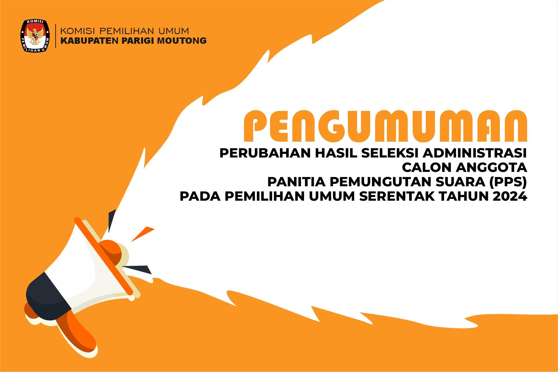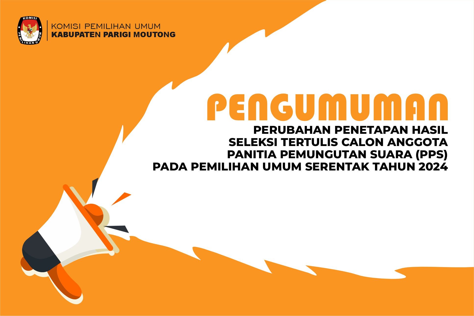 PENGUMUMAN PERUBAHAN PENETAPAN HASIL SELEKSI TERTULIS CALON ANGGOTA PANITIA PEMUNGUTAN SUARA (PPS) PADA PEMILIHAN UMUM TAHUN 2024 Selasa, 17 Januari 2023 00:00 339 FILE PDF PENGUMUMAN PENETAPAN HASIL SELEKSI TERTULIS CALON ANGGOTA PANITIA PEMUNGUTAN SUARA (PPS) PADA PEMILIHAN UMUM TAHUN 2024 DAPAT DILIHAT DISINI Baca Selengkapnya