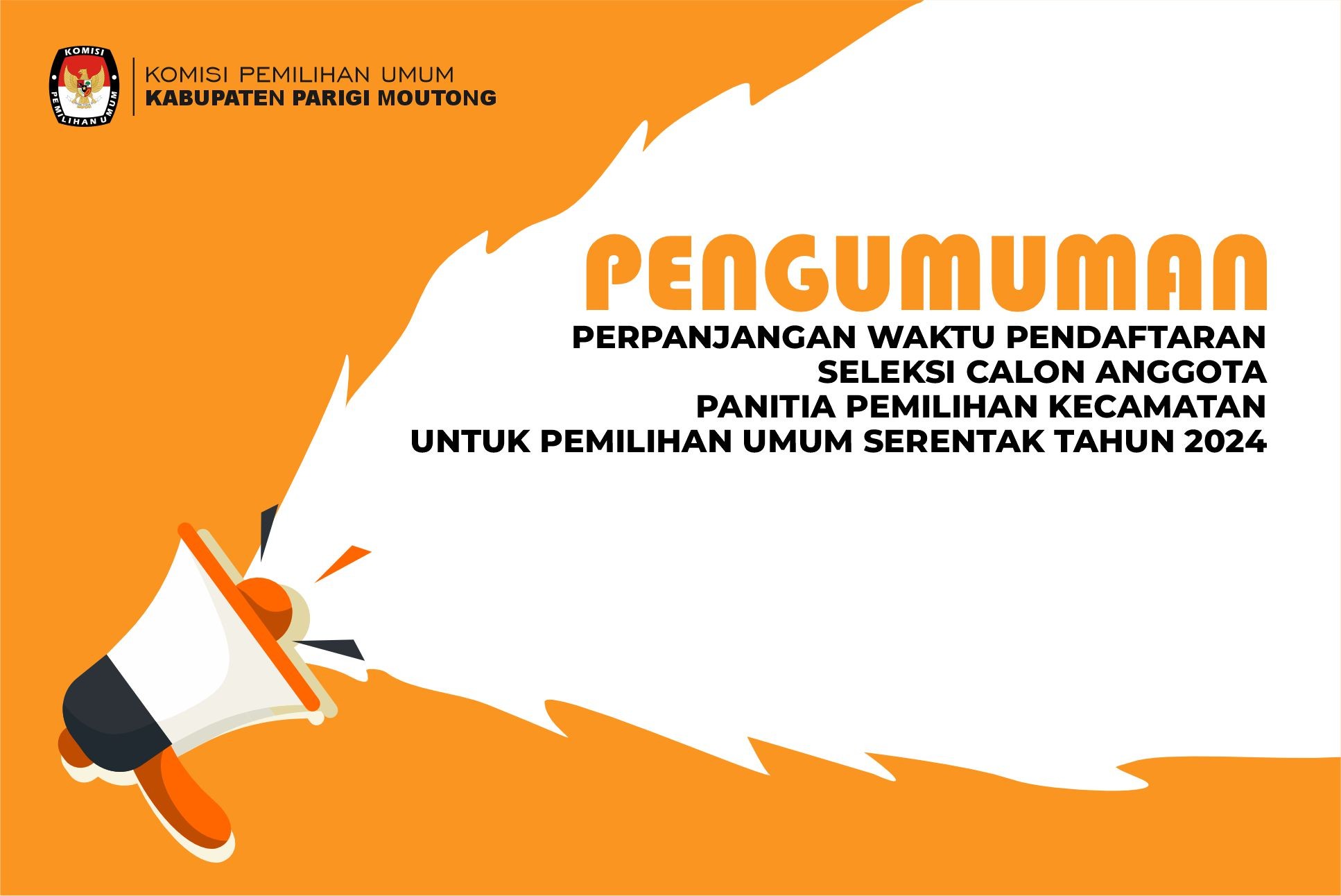 PENGUMUMAN PERPANJANGAN WAKTU PENDAFTARAN SELEKSI CALON ANGGOTA PANITIA PEMILIHAN KECAMATAN UNTUK PEMILIHAN UMUM SERENTAK TAHUN 2024 DAPAT DILIHAT DISINI