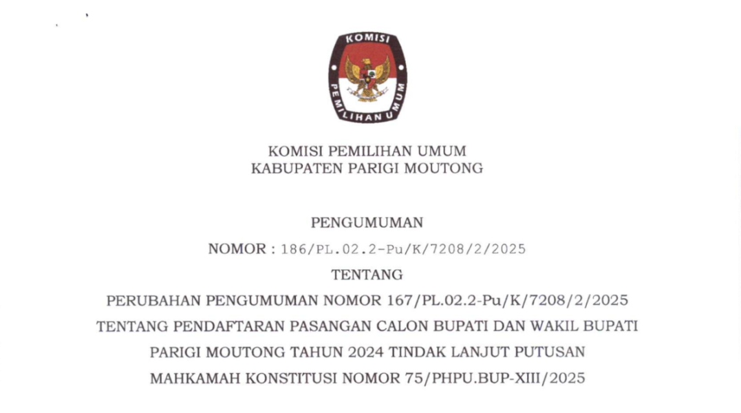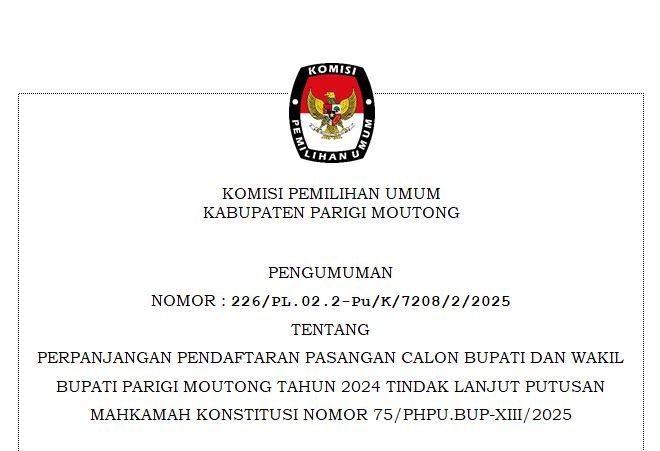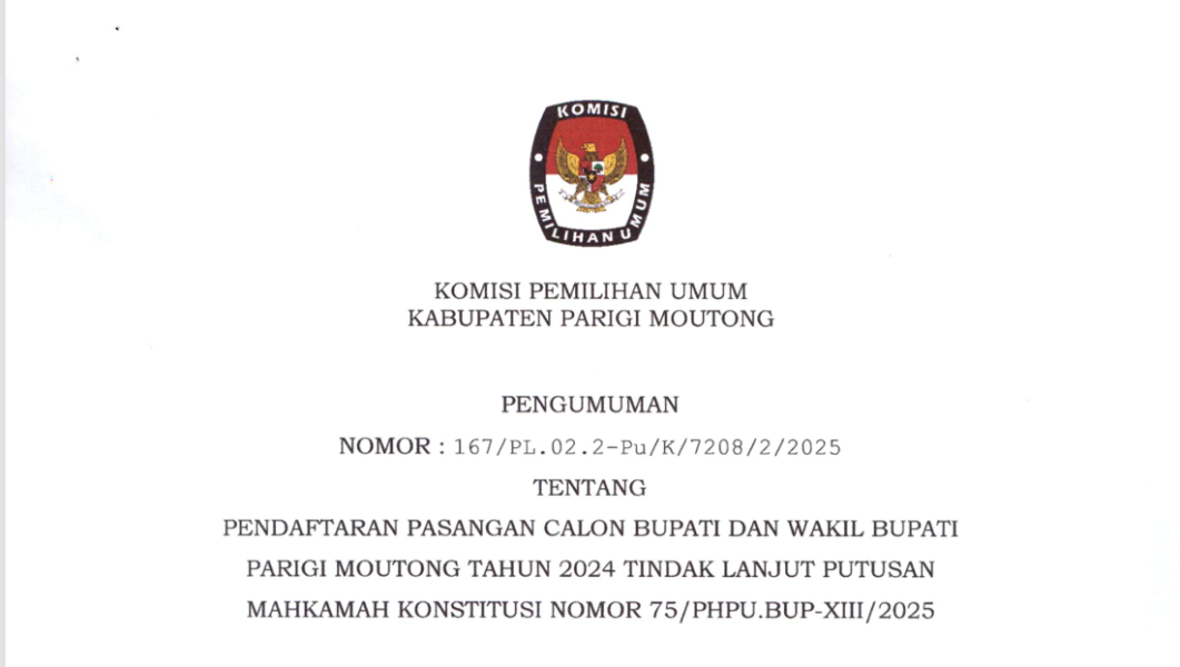 PENGUMUMAN PENDAFTARAN PASANGAN CALON BUPATI DAN WAKIL BUPATI PARIGI MOUTONG TINDAK LANJUT PUTUSAN MK Selasa, 04 Maret 2025 14:00 726 PENGUMUMAN PENDAFTARAN PASANGAN CALON BUPATI DAN WAKIL BUPATI PARIGI MOUTONG TINDAK LANJUT PUTUSAN MK NOMOR: 75/PHPU.BUP-XXIII/2025 SELENGKAPNYA KLIK DISINI Baca Selengkapnya