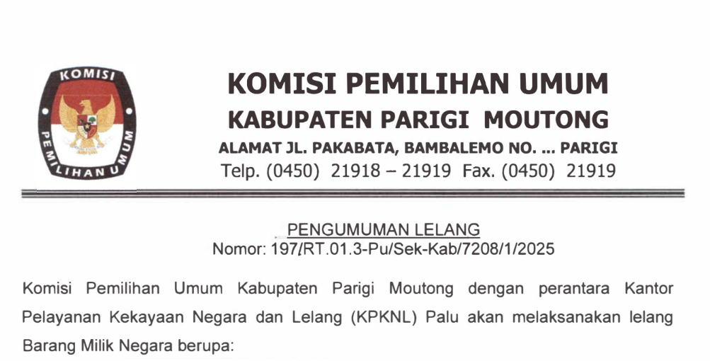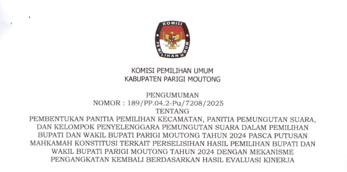 PENGUMUMAN PEMBENTUKAN PPK, PPS, DAN KPPS DALAM PEMILIHAN BUPATI DAN WAKIL BUPATI PARIGI MOUTONG TAHUN 2024 PASCA PUTUSAN MK Sabtu, 08 Maret 2025 17:05 1084 PENGUMUMAN PEMBENTUKAN PPK, PPS, DAN KPPS DALAM PEMILIHAN BUPATI DAN WAKIL BUPATI PARIGI MOUTONG TAHUN 2024 PASCA PUTUSAN MK SELENGKAPNYA KLIK DISINI Baca Selengkapnya