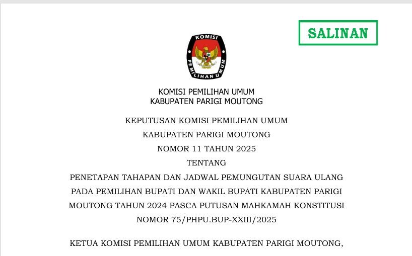 PENETAPAN TAHAPAN DAN JADWAL PEMUNGUTAN SUARA ULANG PADA PEMILIHAN BUPATI DAN WAKIL BUPATI KABUPATEN PARIGI MOUTONG TAHUN 2024 PASCA PUTUSAN MAHKAMAH KONSTITUSI NOMOR 75/PHPU.BUP-XXIII/2025 Sabtu, 08 Maret 2025 16:00 1097 DOWNLOAD DISINI Baca Selengkapnya