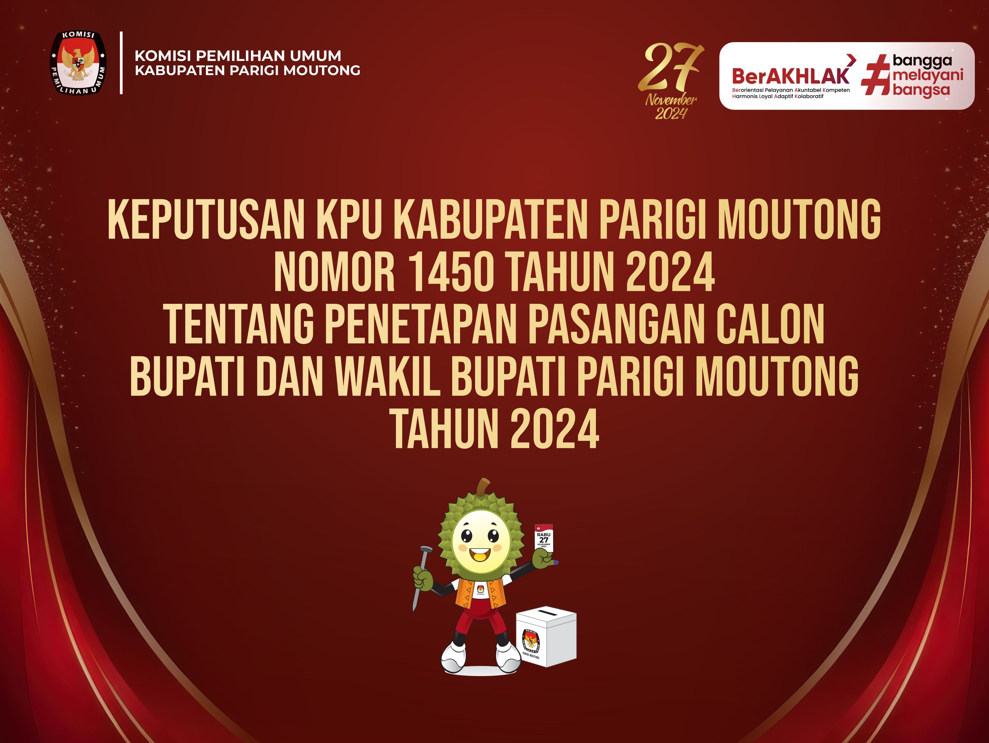 KEPUTUSAN KPU KABUPATEN PARIGI MOUTONG NOMOR 1450 TAHUN 2024 TENTANG PENETAPAN PASANGAN CALON BUPATI DAN WAKIL BUPATI PARIGI MOUTONG TAHUN 2024 Minggu, 22 September 2024 18:30 180 Selengkapnya KLIK DISINI Baca Selengkapnya