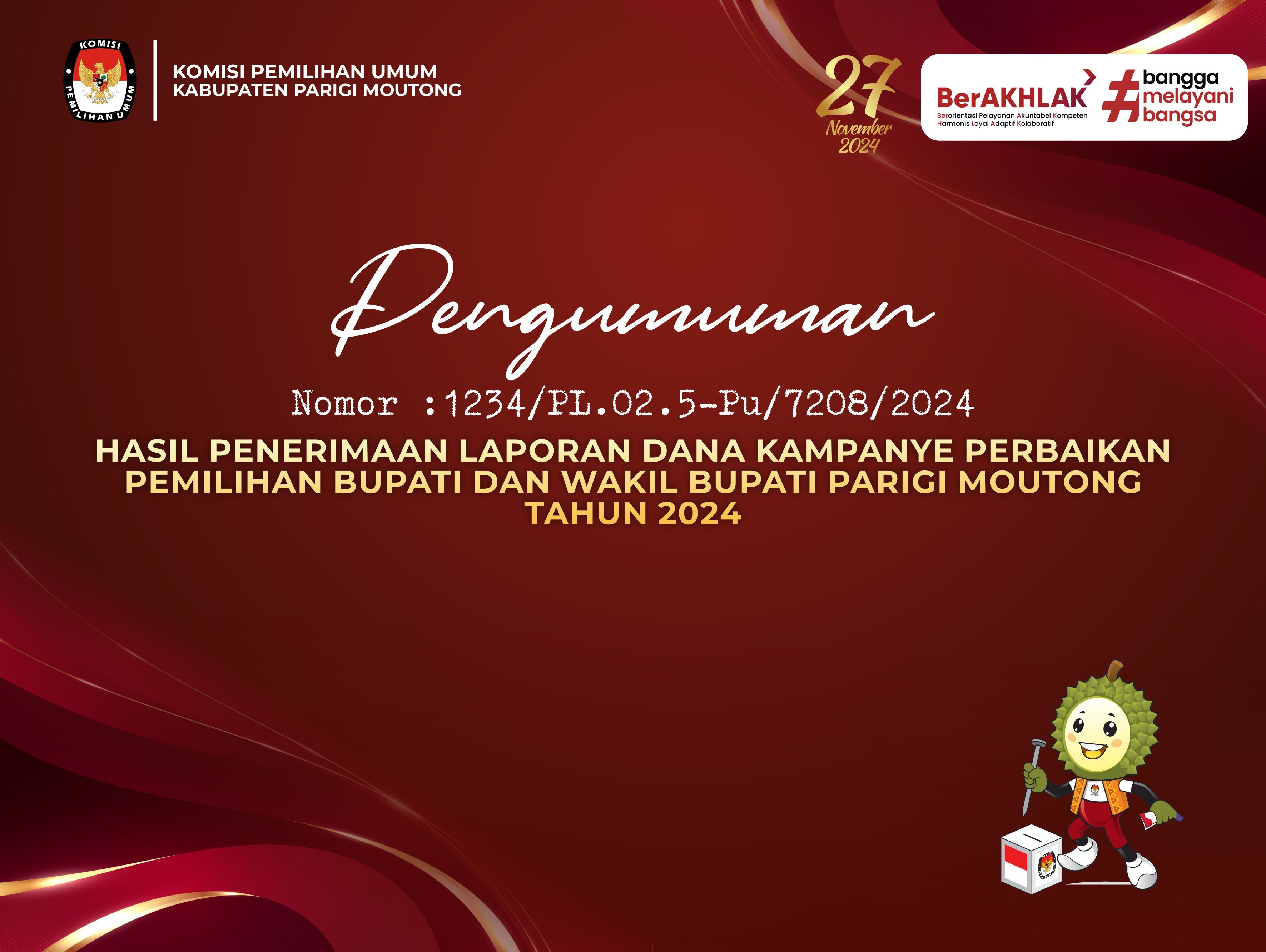 PENGUMUMAN HASIL PENERIMAAN LAPORAN AWAL DANA KAMPANYE PERBAIKAN PEMILIHAN BUPATI DAN WAKIL BUPATI PARIGI MOUTONG TAHUN 2025 Sabtu, 28 September 2024 23:00 100 Pengumuman Selengkapnya... KLIK DISINI Baca Selengkapnya