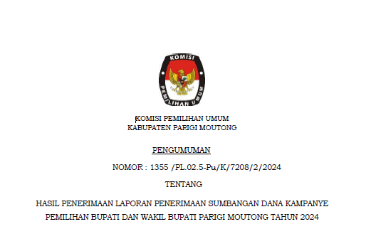PENGUMUMAN HASIL PENERIMAAN SUMBANGAN DANA KAMPANYE PEMILIHAN BUPATI DAN WAKIL BUPATI PARIGI MOUTONG TAHUN 2024 Sabtu, 26 Oktober 2024 21:00 108 DOWLOAD DISINI Baca Selengkapnya