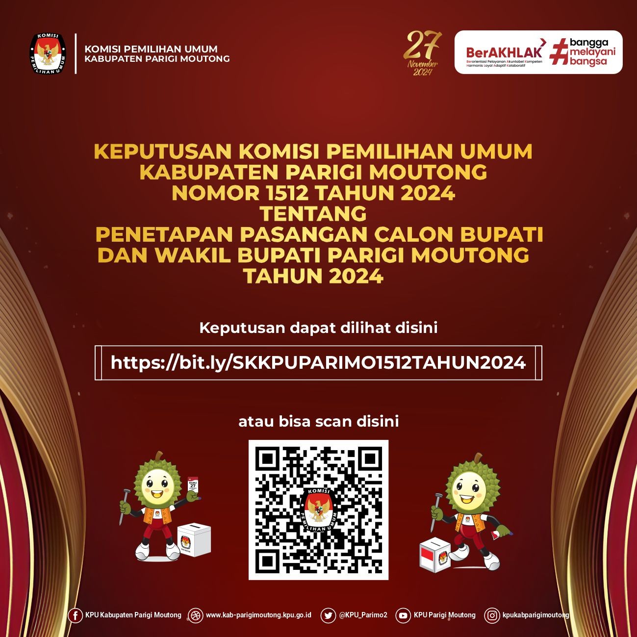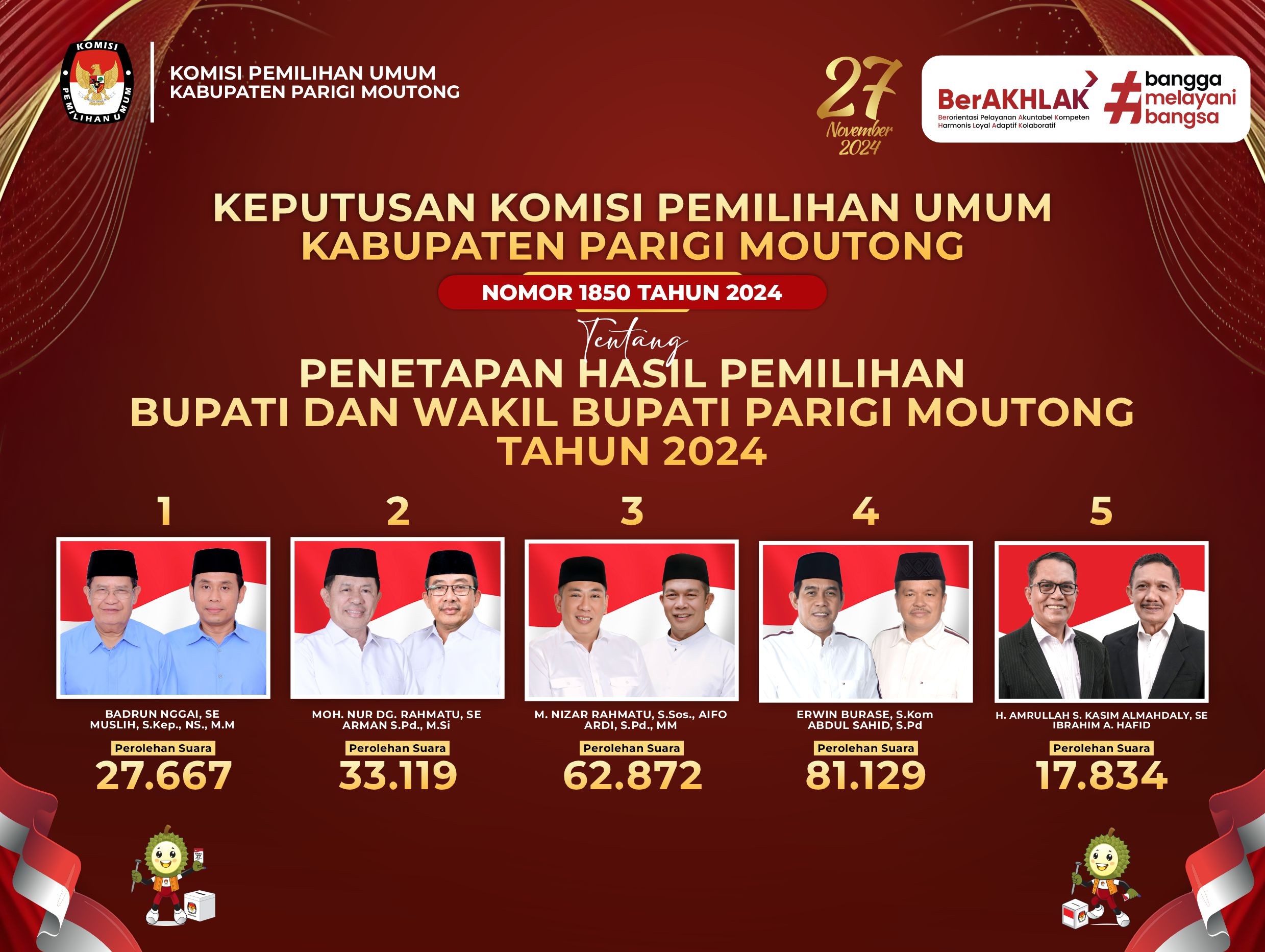 PENETAPAN HASIL PEMILIHAN BUPATI DAN WAKIL BUPATI PARIGI MOUTONG TAHUN 2024 Kamis, 05 Desember 2024 12:55 158 Keputusan Komisi Pemilihan Umum Kabupaten Parigi Moutong Nomor 1850 Tahun 2024 Tentang Penetapan Hasil Pemilihan Bupati dan Wakil Bupati Parigi Moutong Tahun 2024 Selengkapnya Klik Disini Baca Selengkapnya