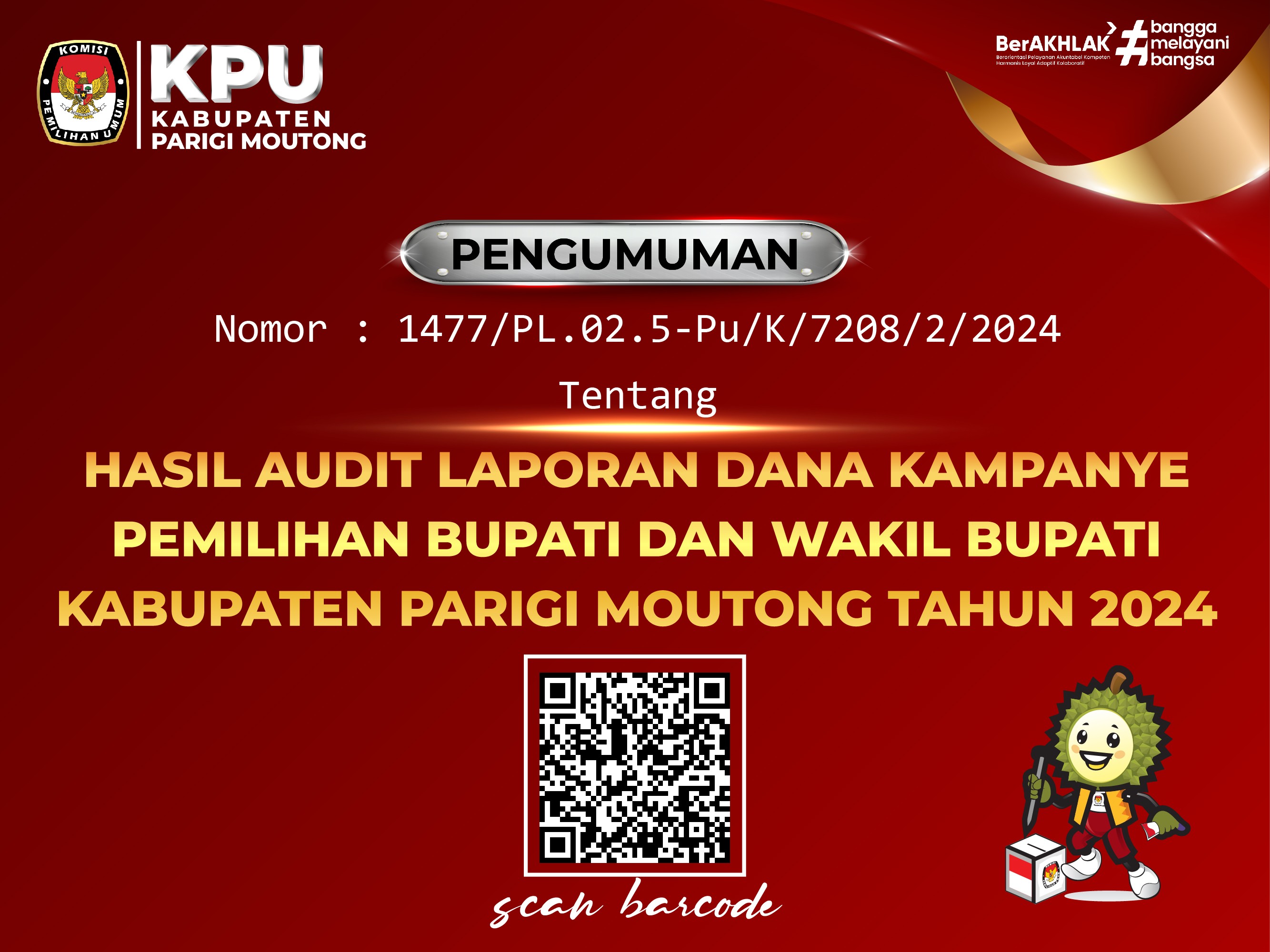 PENGUMUMAN HASIL AUDIT LAPORAN DANA KAMPANYE PEMILIHAN BUPATI DAN WAKIL BUPATI KABUPATEN PARIGI MOUTONG TAHUN 2024 Minggu, 15 Desember 2024 17:52 210 DOWLOAD DISINI Baca Selengkapnya