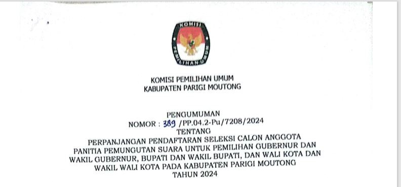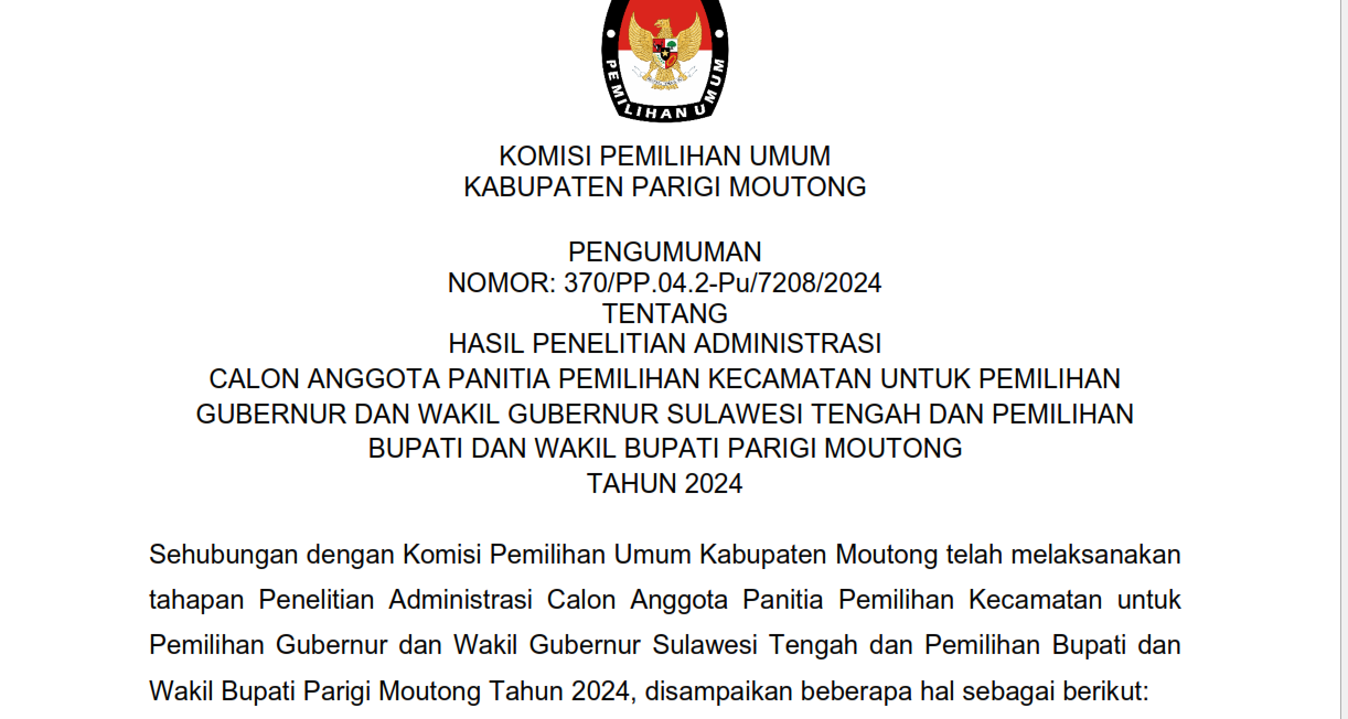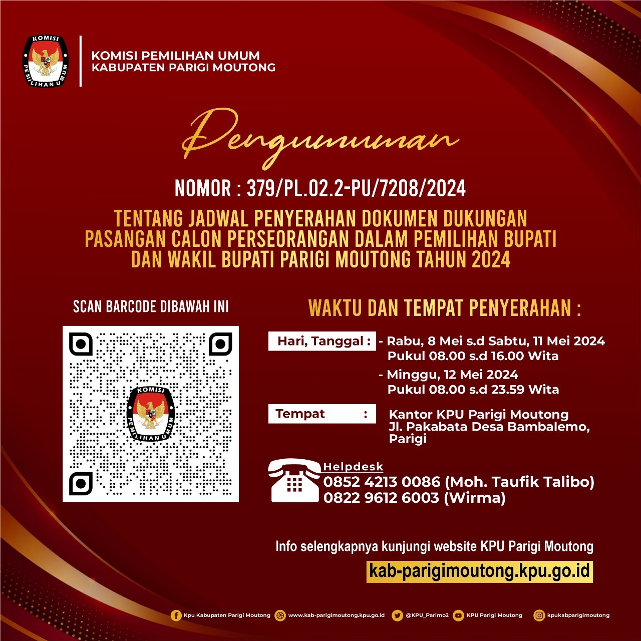 PENGUMUMAN TENTANG JADWAL PENYERAHAN DOKUMEN DUKUNGAN PASANGAN CALON PERSEORANGAN DALAM PEMILIHAN BUPATI DAN WAKIL BUPATI KABUPATEN PARIGI MOUTONG Minggu, 05 Mei 2024 16:00 254 Silahkan dowload disini Baca Selengkapnya