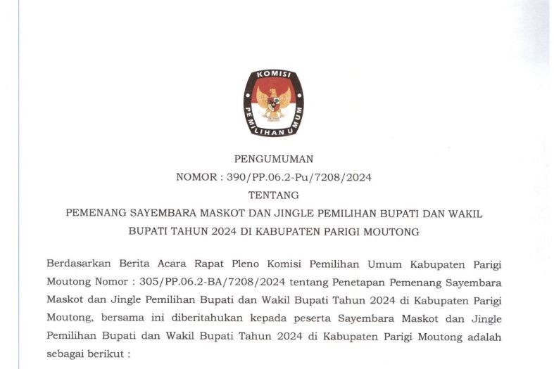 Pemenang Sayembara Maskot dan Jingle Pemilihan Bupati dan Wakil Bupati Kabupaten Parigi Moutong Tahun 2024 Kamis, 09 Mei 2024 22:00 403 Download Disini Baca Selengkapnya