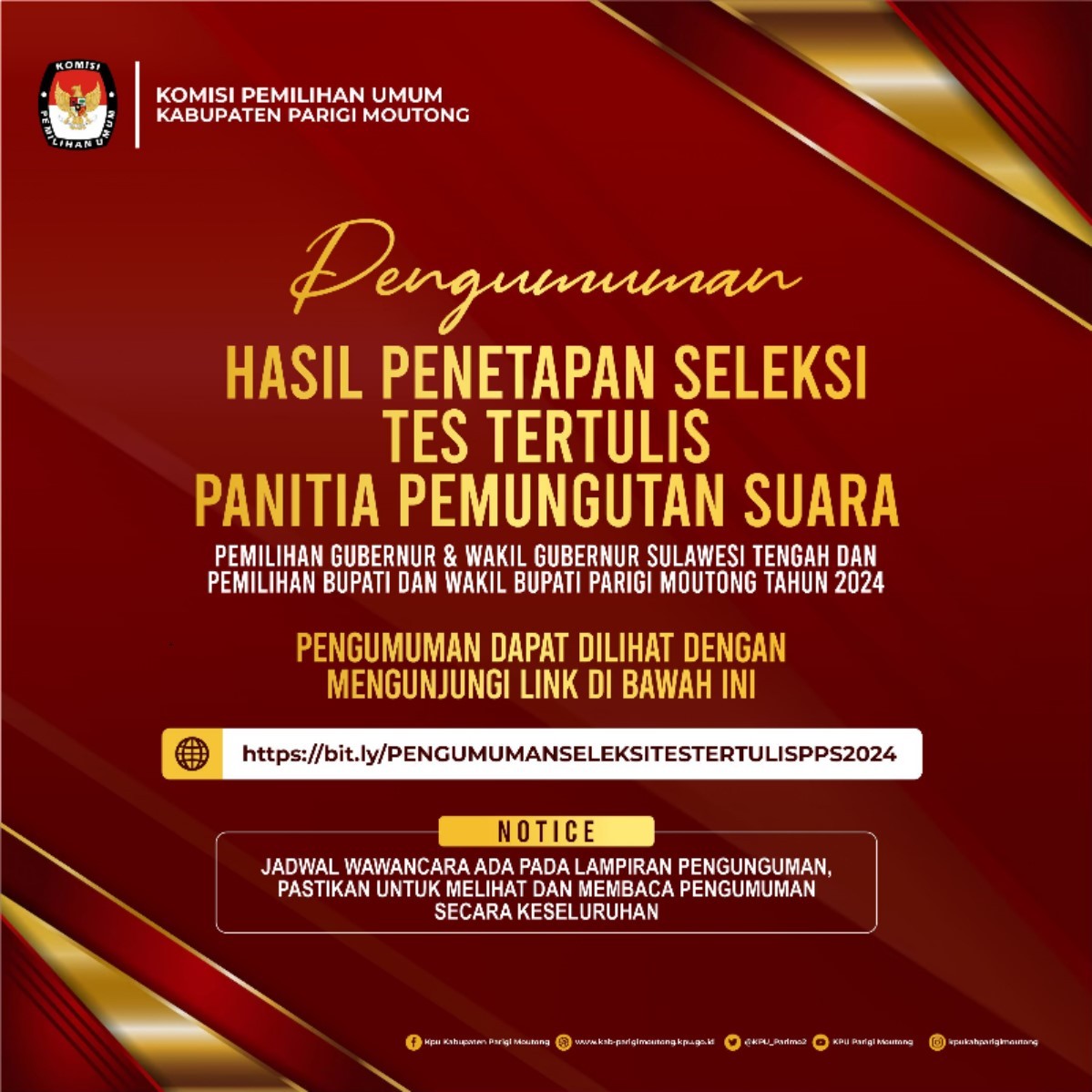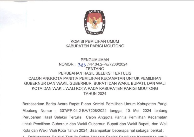 PERUBAHAN PENGUMUMAN HASIL SELEKSI TERTULIS CALON ANGGOTA PANITIA PEMILIHAN KECAMATAN Jumat, 10 Mei 2024 07:00 673 Silahkan Dowload Disini Baca Selengkapnya