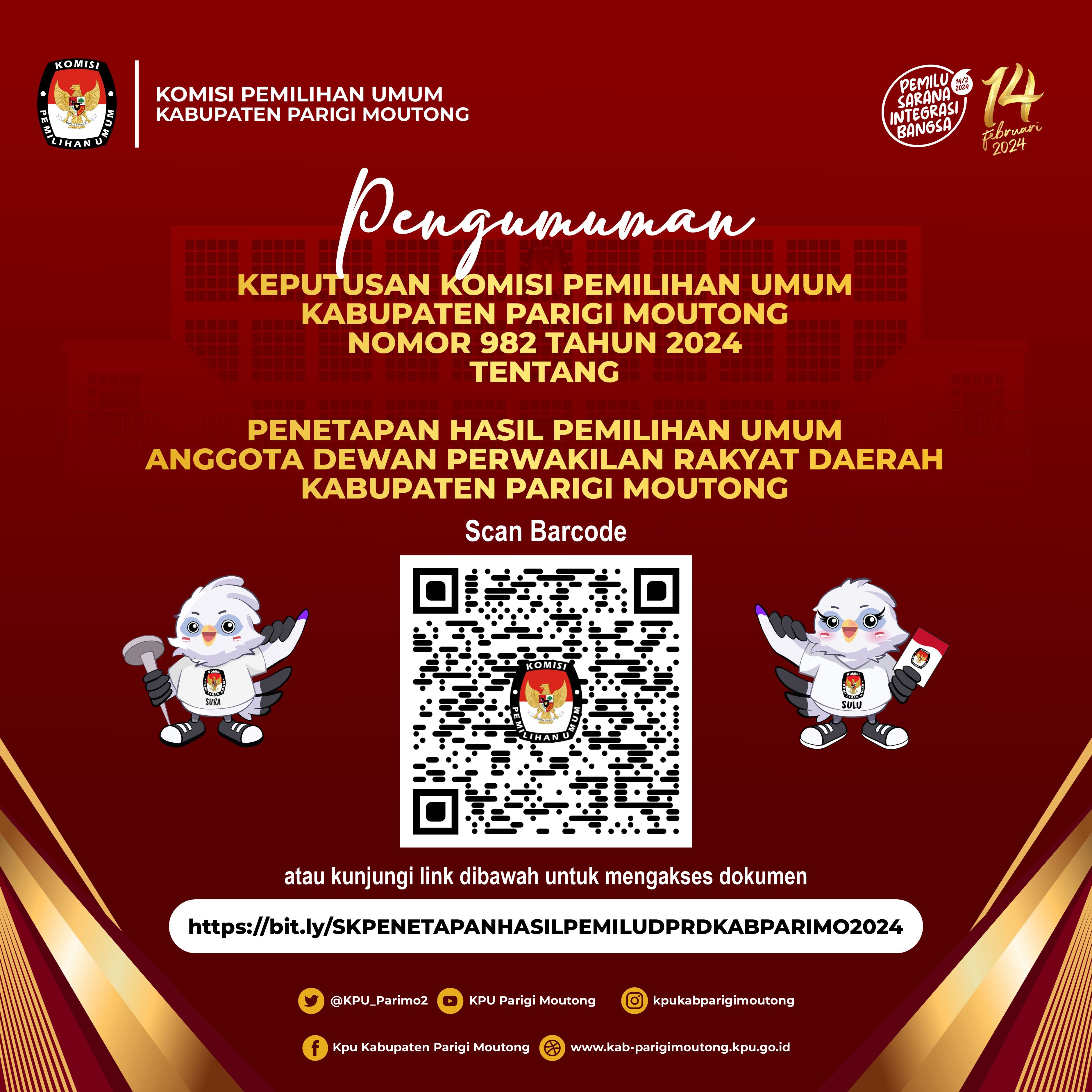 PENGUMUMAN KEPUTUSAN KOMISI PEMILIHAN UMUM KABUPATEN PARIGI MOUTONG NOMOR 982 TAHUN 2024 TENTANG PENETAPAN HASIL PEMILIHAN UMUM ANGGOTA DEWAN PERWAKILAN RAKYAT DAERAH KABUPATEN PARIGI MOUTONG Sabtu, 02 Maret 2024 20:00 531 KLIK DISINI Baca Selengkapnya