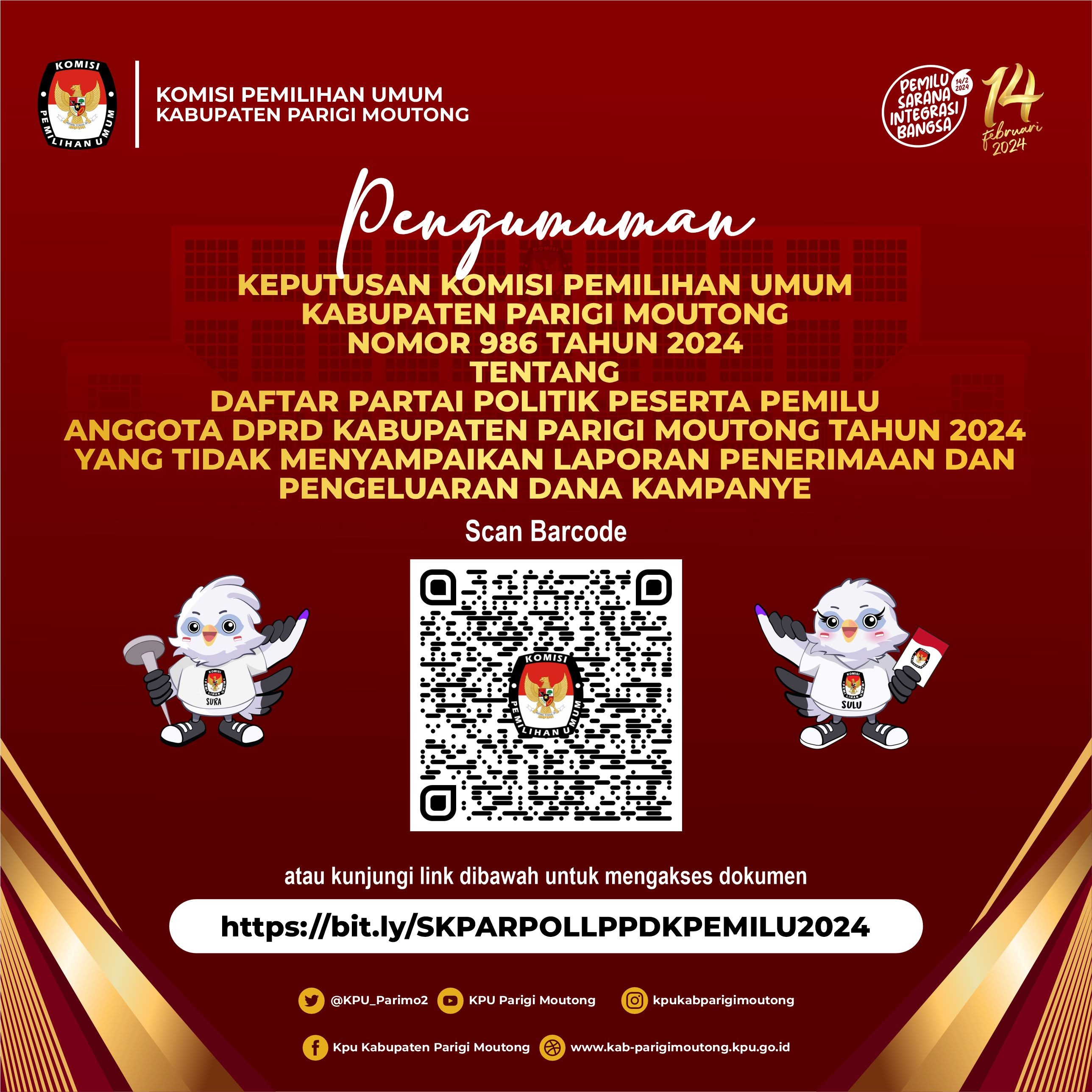 PENGUMUMAN KEPUTUSAN KPU KABUPATEN PARIGI MOUTONG TENTANG DAFTAR PARTAI POLITIK PESERTA PEMILU ANGGOTA DPRD KABUPATEN PARIGI MOUTONG TAHUN 2024 YANG TIDAK MENYAMPAIKAN LPPDK Kamis, 07 Maret 2024 15:07 330 DOWNLOAD DISINI Baca Selengkapnya