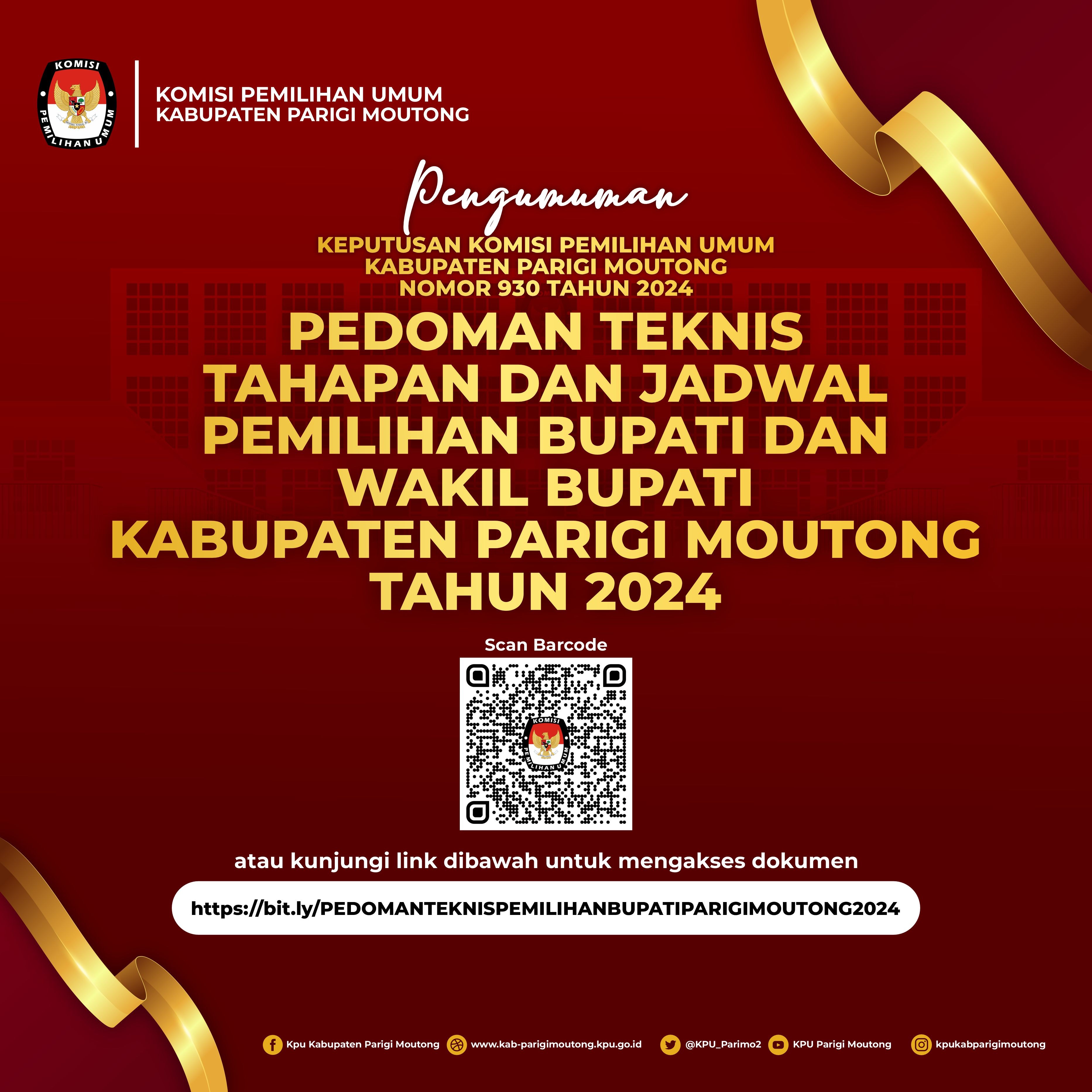 PENGUMUMAN KEPUTUSAN KPU KABUPATEN PARIGI MOUTONG TENTANG PEDOMAN TEKNIS TAHAPAN DAN JADWAL PEMILIHAN BUPATI DAN WAKIL BUPATI KABUPATEN PARIGI MOUTONG TAHUN 2024 Kamis, 07 Maret 2024 16:33 279 Download Disini Baca Selengkapnya