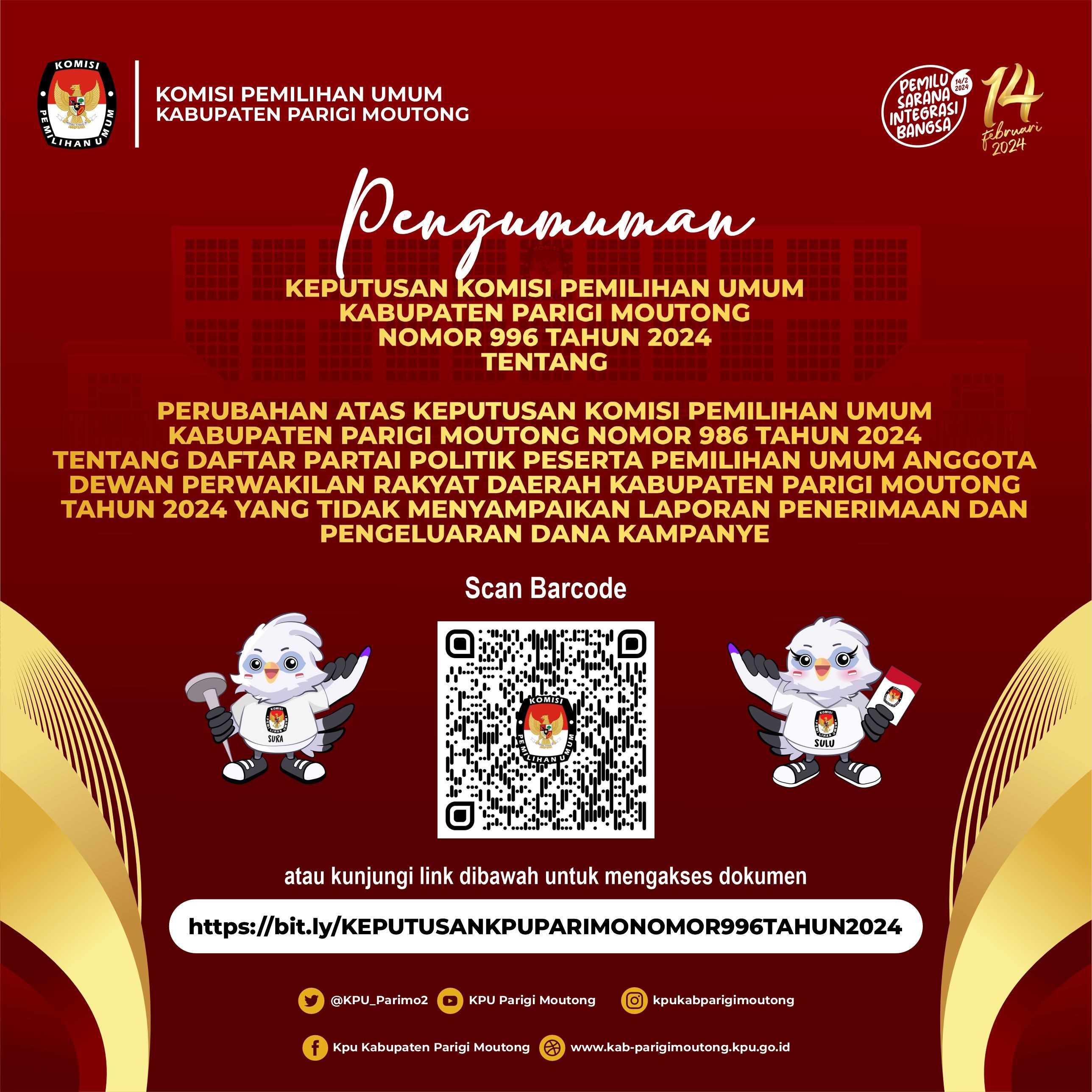 PENGUMUMAN PERUBAHAN KEPUTUSAN KPU KABUPATEN PARIGI MOUTONG NOMOR 996 TAHUN 2024 TENTANG PERUBAHAN ATAS KEPUTUSAN KPU KABUPATEN PARIGI MOUTONG NOMOR 986 TAHUN 2024 Selasa, 19 Maret 2024 22:40 243 DOWNLOAD DISINI Baca Selengkapnya