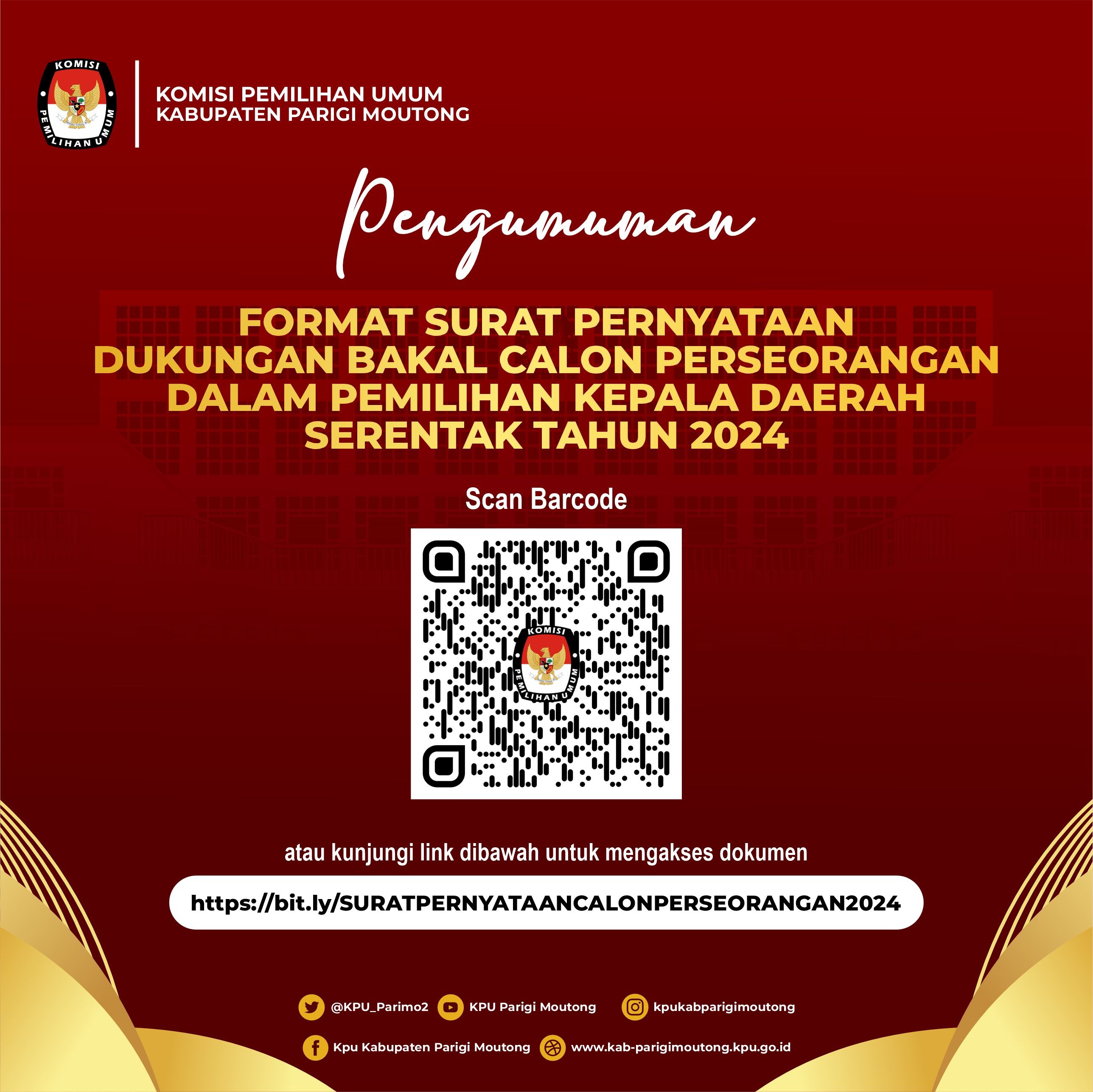 Format Surat Pernyataan Dukungan Bakal Calon Perseorangan dalam Pilkada Serentak Tahun 2024 Jumat, 05 April 2024 07:00 194 BERIKUT SURAT PERNYATAAN DUKUNGAN BAKAL PASANGAN CALON PERSEORANGAN DALAM PEMILIHAN BUPATI DAN WAKIL BUPATI PARIGI MOUTONG TAHUN 2024 DOWNLOAD DISINI Baca Selengkapnya